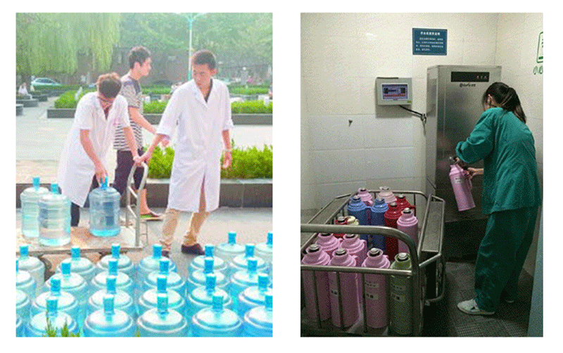 过去大多数医院的饮用水都是采用电开水炉将自来水烧开后供给,部分医院采用桶装水,但是随着人们饮水质量要求和习惯的改变,这两种饮用水供应方式已经满足不了人们的需求,而且这样的饮水方式也给患者带来诸多不便。水污染日益严重、自来水厂氯气消毒方式、自来水管老化破裂漏水、大型水箱长时间不清洗等等这些问题导致自来水含有重金属、细菌、余氯等有害物质,仅仅通过电开水炉将自来水烧开,是不足以消灭这些有害物质;而桶装水二次污染、水质容易过期、更换麻烦、成本等问题也造成不少的困扰.