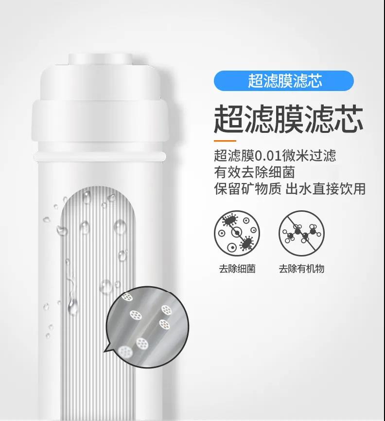 超滤膜滤芯的作用:水中的细菌以及比细菌体积大得多的胶体、铁锈、悬浮物、泥沙、大分子有机物等都能被超滤膜截留,一般用于净水机的第三级。过滤精度达0.01μm。
