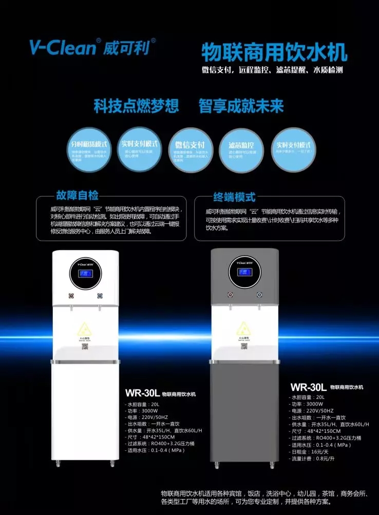 威可利智能物联网“云”节能商用饮水机通过信息实时传输,可按使用需求实现计量收费/计时收费/扫码共享饮水等多种饮水方案。