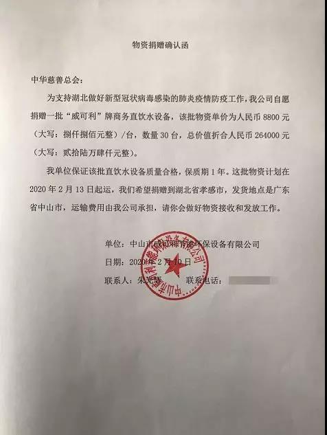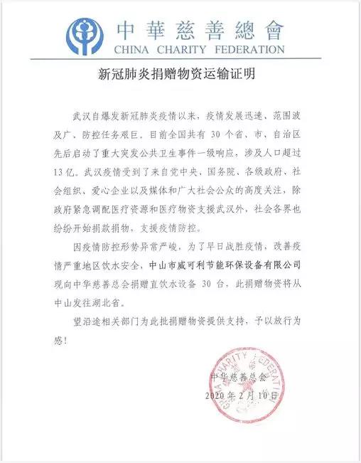 当前,新型冠状病毒感染的肺炎疫情已全面进入攻坚战,中山市威可利节能环保设备有限公司决定通过中华慈善总会,向湖北孝感市捐赠一批“威可利”牌商务直饮水设备,并组建团队为受赠单位提供技术支持。为奋战在一线的医护人员提供一杯安全的净水!