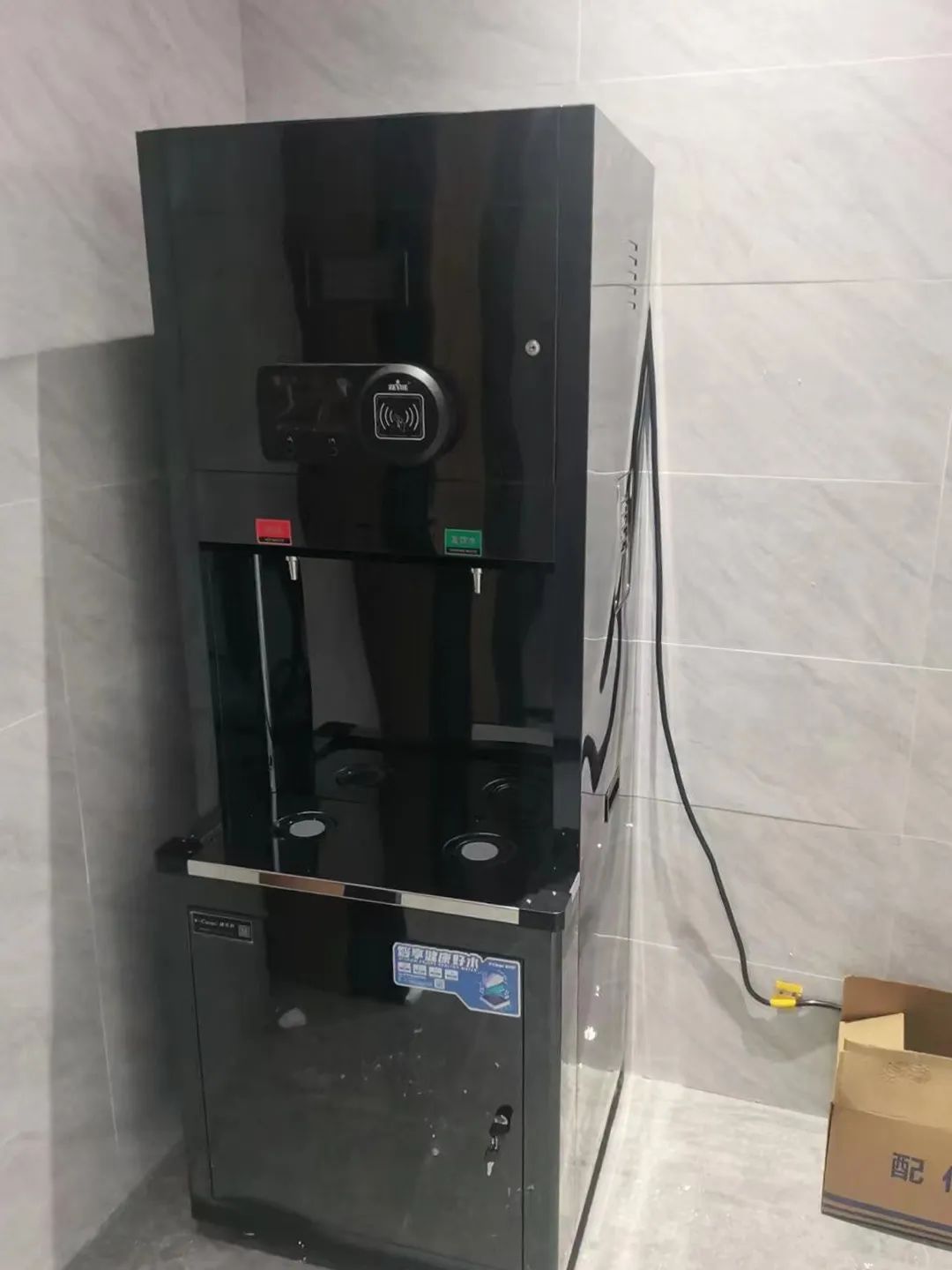 在智能方面,该直饮机搭载了智能微电脑控制系统,自动进水、自动加热、定时开关机、故障自检等等,全自动运行,无需专人看管;而直饮机的运行状态、水温、时间、故障提醒等信息则清晰明了地显示在设备上方的高清LED显示屏;直饮机还加装了刷卡系统,只需把水卡放到感应区,然后选择开水或者直饮水便可轻松取水,取水完毕后自动扣费,不仅方便快捷,还能提高学生们节约用水、珍惜水源的意识。