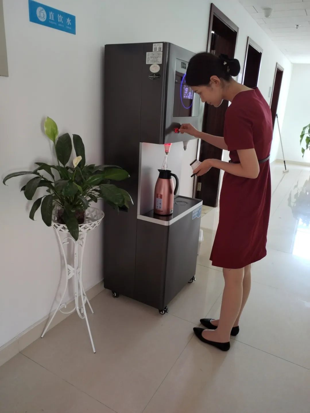 在使用体验上,直饮机搭载了智能微电脑控制系统,自动进水、自动加热、定时开关机,实时监测等,全自动运行,无需专人看管;直饮机还配备一块大大的高清显示屏,设备运行状态、水质情况、滤芯使用情况等等信息都可以轻松掌握;一开一直饮两种不同的出水方式,既可以满足工作人员泡茶冲咖啡的需求,又可以满足即取即饮的需求,取水时只需轻轻一按,便可得到安全又健康的开水或者直饮水。