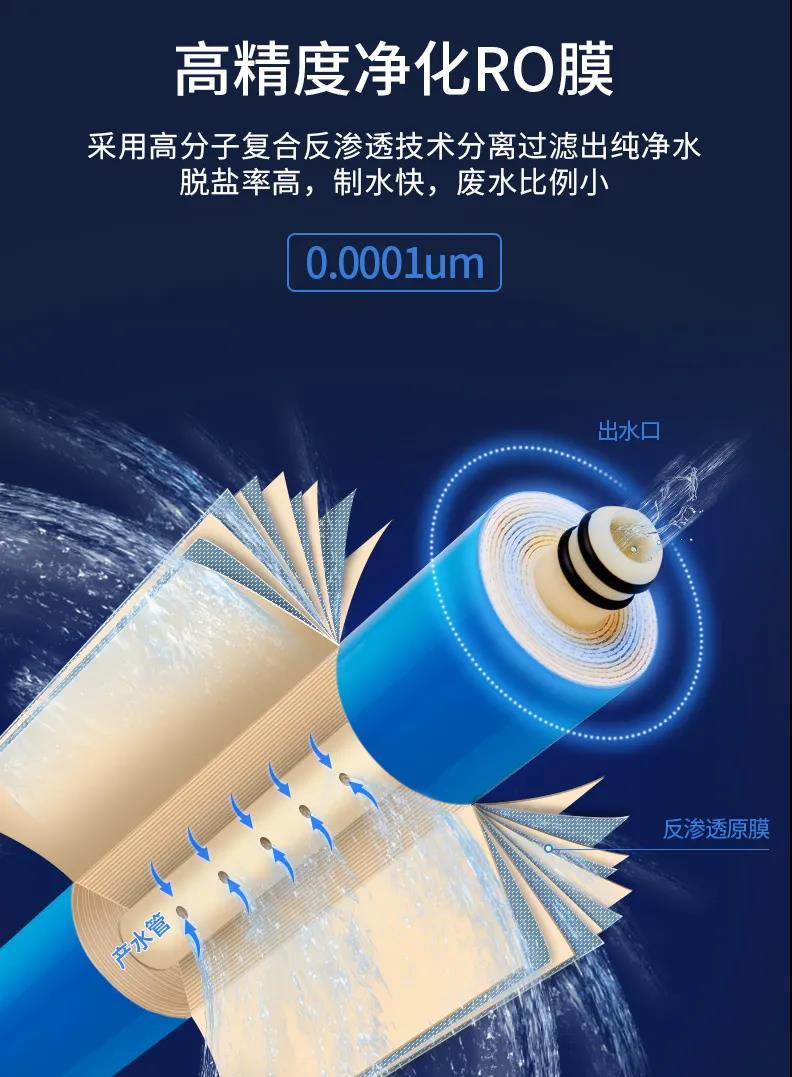 RO膜的作用:能够有效的去除水中钙、镁、细菌、有机物、无机物、金属离子和放射性物质等,过滤精度达0.0001μm。由于RO膜孔径太小,为了延长RO膜的使用寿命,要进行pp棉、活性碳等过滤等预处理,所以RO膜一般放在第四级使用。